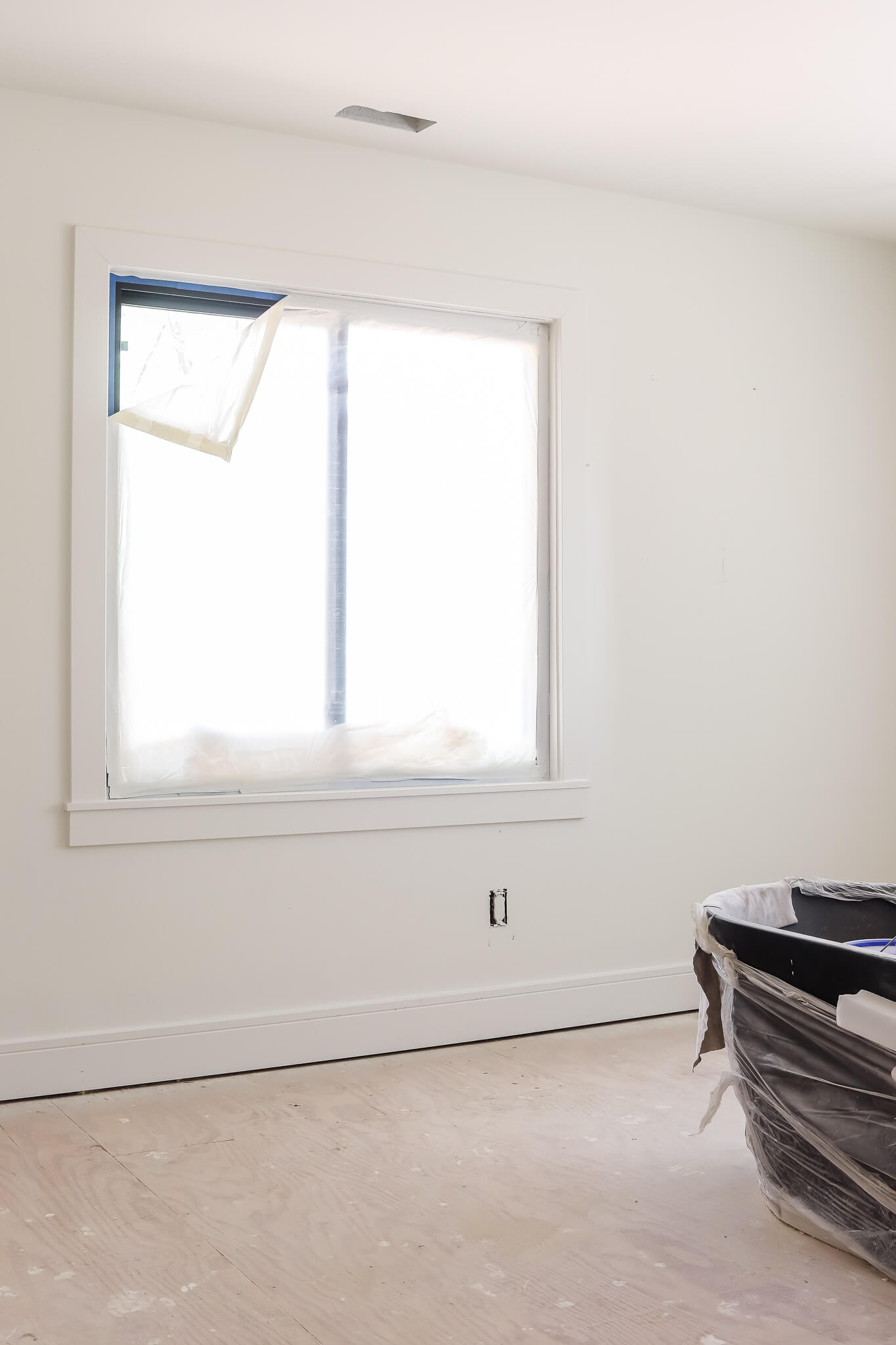 unfinished room with white walls and trim and window covered in painters plastic